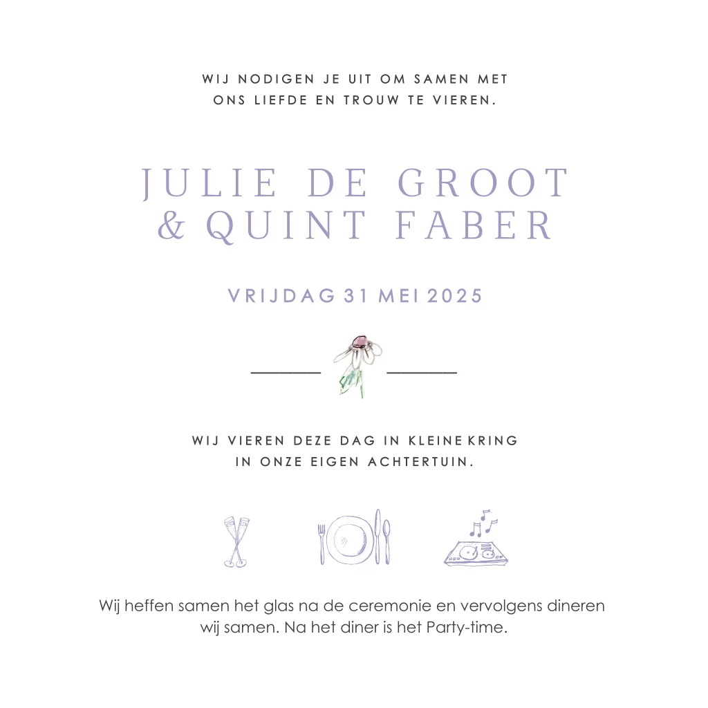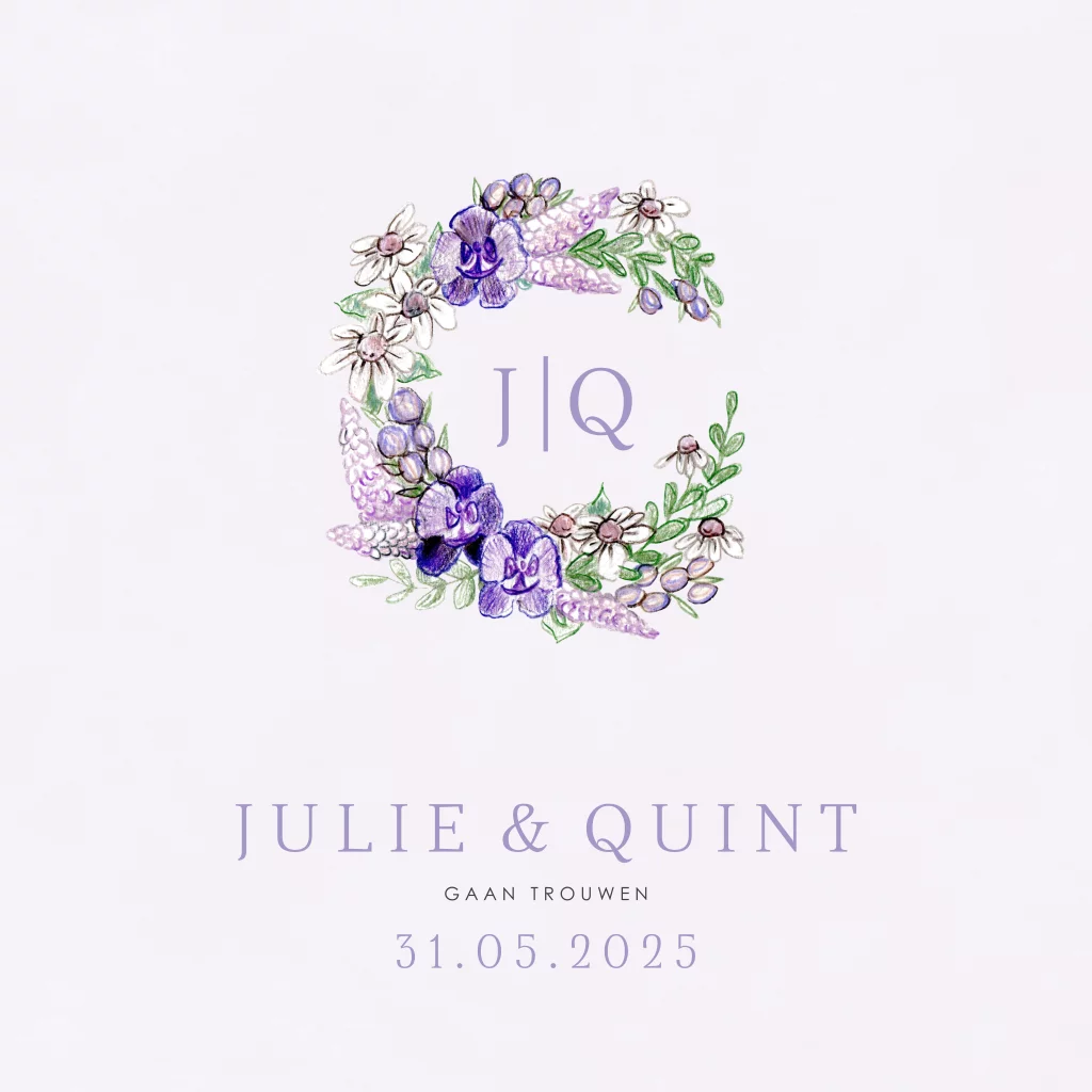 Romantische trouwuitnodiging lila bloemen krans. Modern, handgetekend, tijdloos en chique!