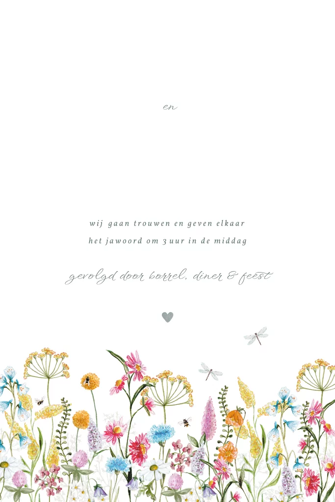 Trouwkaart met getekende veldbloemen. Makkelijk je eigen kaart aanpassen met de editor naar een andere kleur door de achtergrond aan te passen. De kaart in een ander formaat? Heb je een bijpassend kaartje nodig? Het is allemaal mogelijk! Mail of bel en ik help je verder.