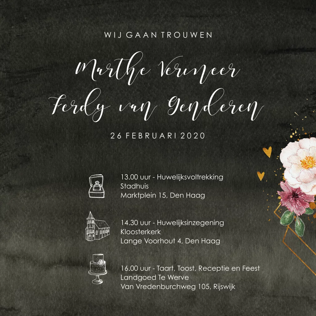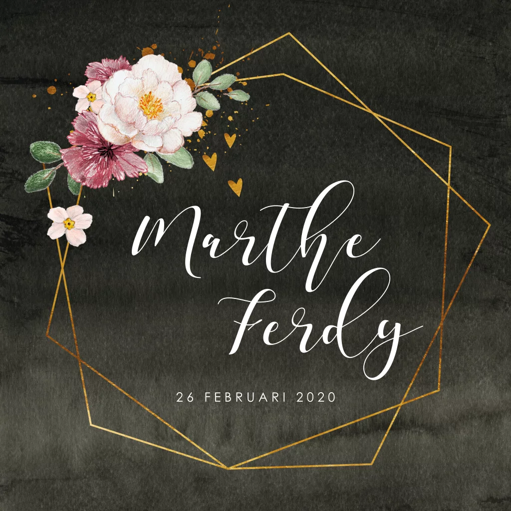 Trouwkaart moody geometrisch flowers. Stoere zwarte aquarel met gouden en lijnen en mooie watercolor bloemen. Maak je eigen kaart met de editor. Er is genoeg keuze uit prachtige afbeeldingen, clip-art en lettertypes. Vragen? Neem contact op!